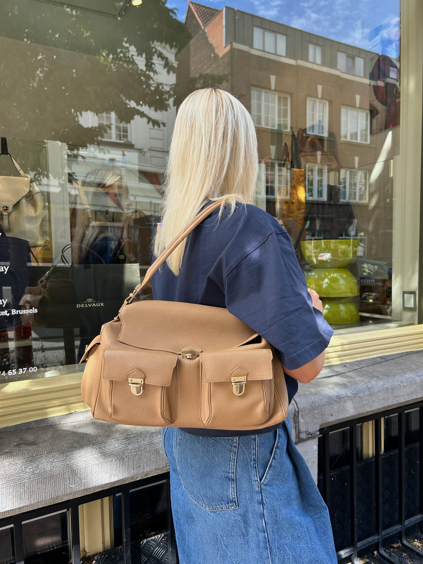 The Delvaux Coquin Poches Shoulder Bag in blush is a chic blend of elegance and practicality. Made from jumping calf leather, it features three front pockets with gold-tone clasps and a structured yet playful shape. Finished with a curved shoulder strap, this rare design is both stylish and functional—perfect as your everyday companion!