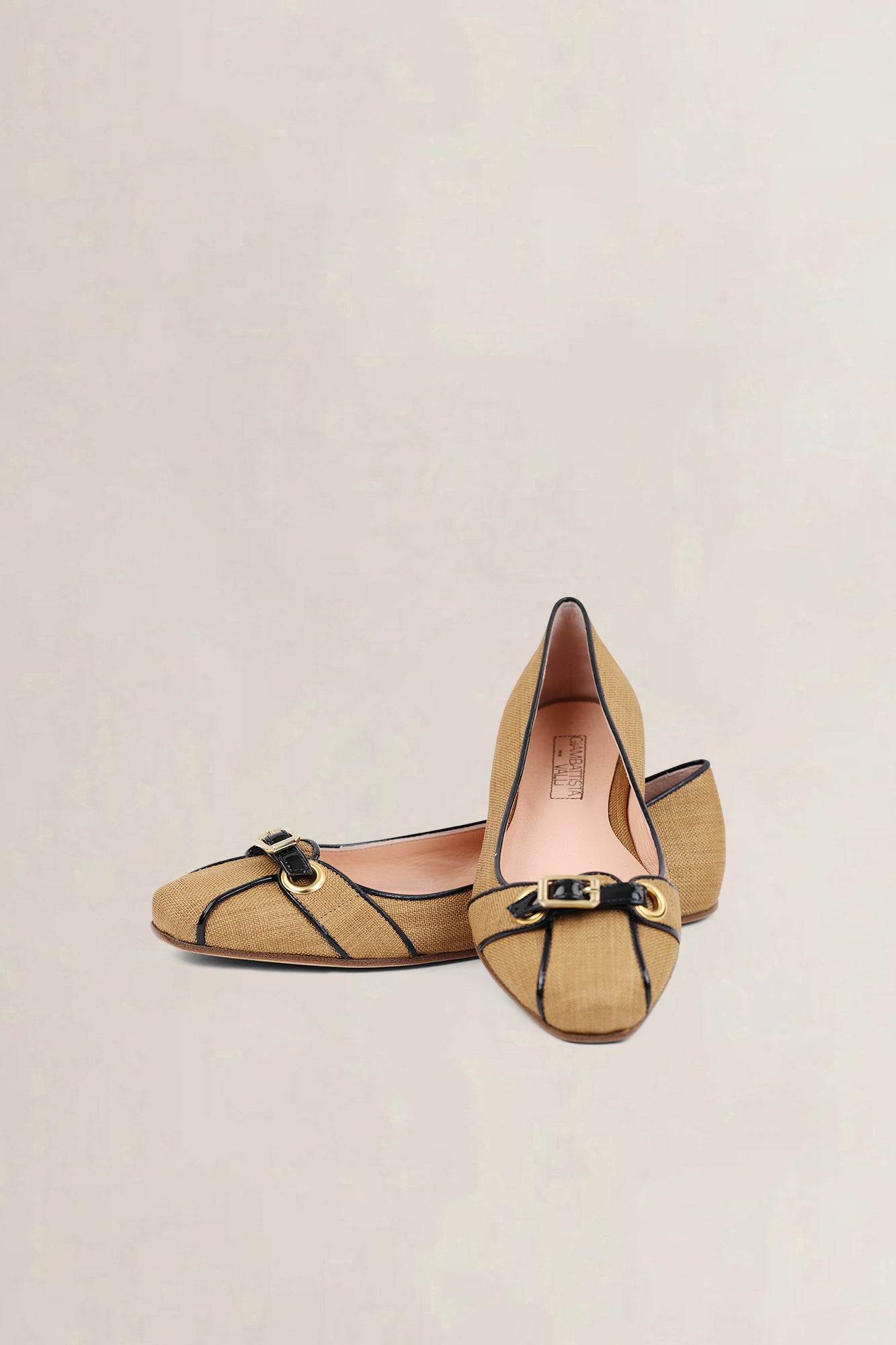 These elegant Giambattista Valli ballerinas are made from natural linen with contrasting black piping and a delicate bow detail accented by gold-tone hardware. The soft leather lining and flat sole ensure all-day comfort, perfect for both city strolls and summer occasions.